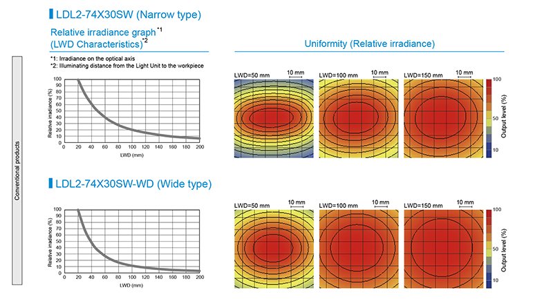 Power consumption values are different between the conventional products and high-power type products. Before use, make sure that the total power consumption of the Light Units is within the output power capacity of the Control Unit. Optional accessories are applicable to the new products as well as to the conventional products of the same size. For details on the optional accessories that are applicable to the Light Units with the newly added size, refer to the lineup tables under "Options."